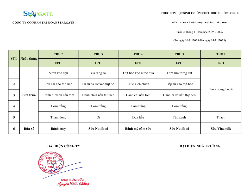 Thực đơn bán trú Tuần 2 - Thánh 11 - 2025