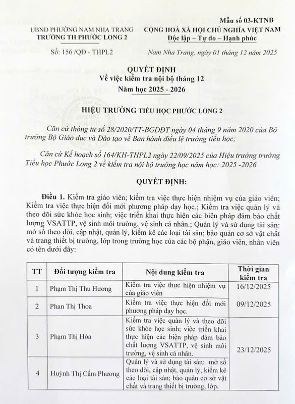 QUYẾT ĐỊNH - Về việc Kiểm tra nội bộ Tháng 12-2025
